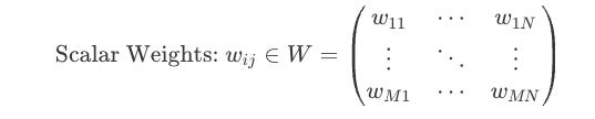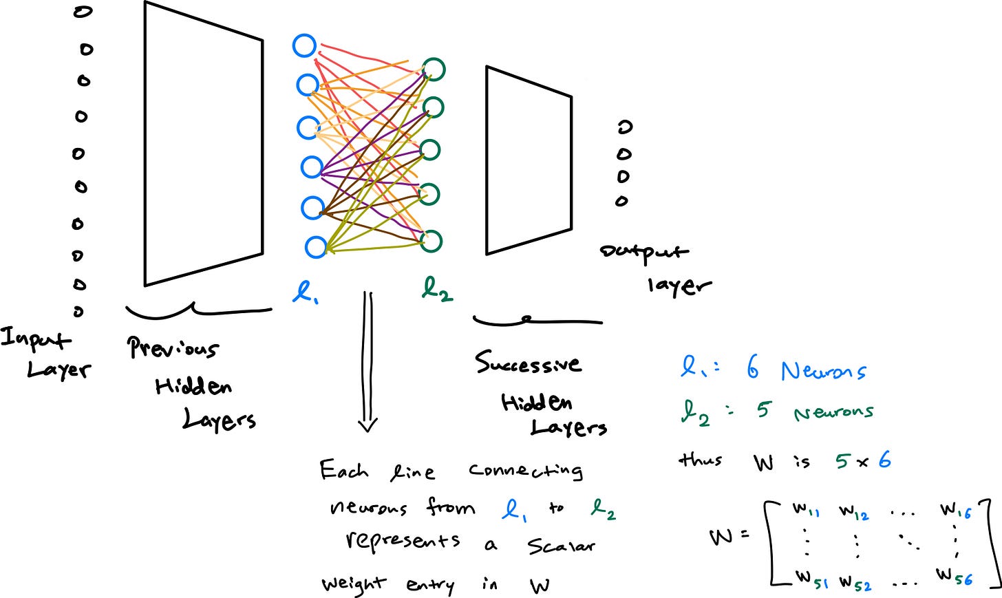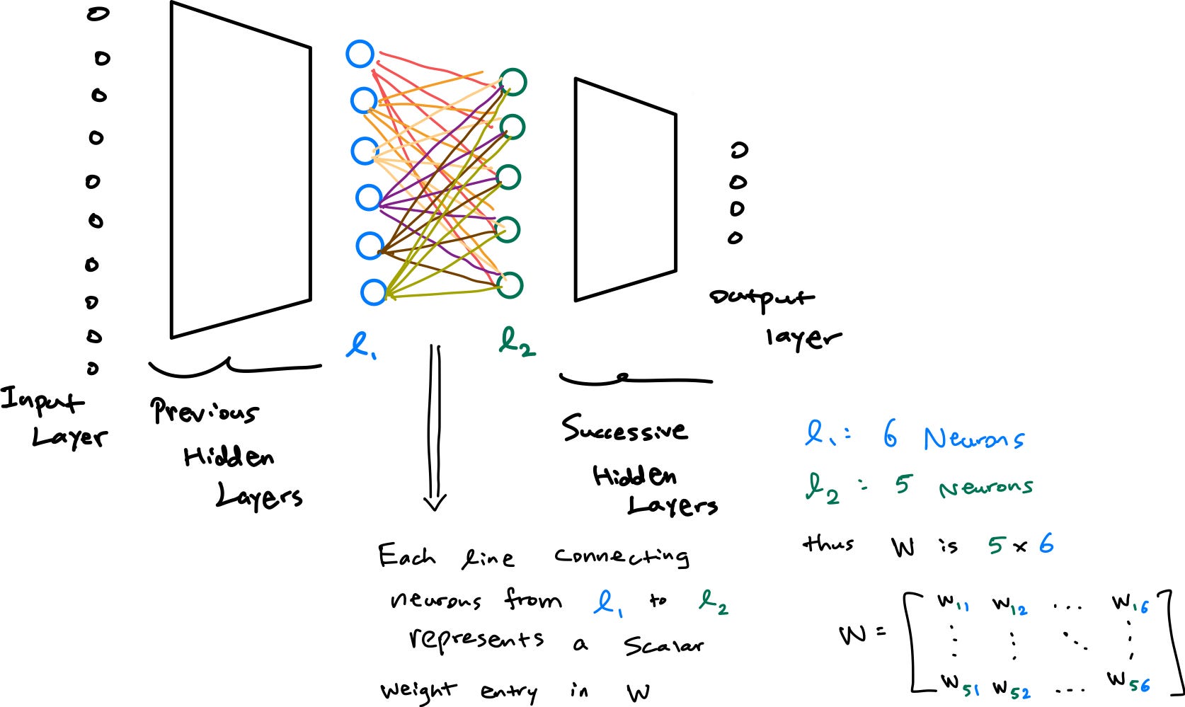 Let two subsequent layers in an MLP be denoted as l1 and l2, respectively. Each ‘connection’ of nodes between l1 and l2 are defined by scalar weights which collectively form a weight matrix that defines initial transformations for each neuron in l1 to l2. To put this more clearly, if l1 has N nodes and l2 has M nodes, the weight matrix W is an M x N matrix. Each entry w_ij in W is the scalar weight for connection of node j in l1 to node i in l2.