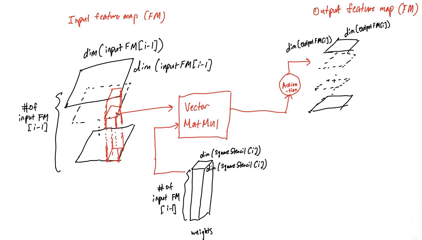 In the following diagram (referenced from Hennessy and Patterson Fig 7.9), we see the feature map passage between input and output layers, augmented by a vector MatMul w/ weights. Due to the number of neurons and weights involved in these MatMul operations, CNNs can have less weights but greater arithmetic intensity than fully-connected MLPs.