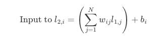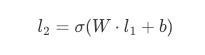 Now, the operation that defines the output of a single node in l2 is simply the dot product between the corresponding scalar value from W and the value of the node ! Let us consider node i in layer l2, its input value (before the activation function) is the sum of the products of every output l_1j from the previous layer l2 and its corresponding weight w_ij from the matrix W, plus a bias b_i: