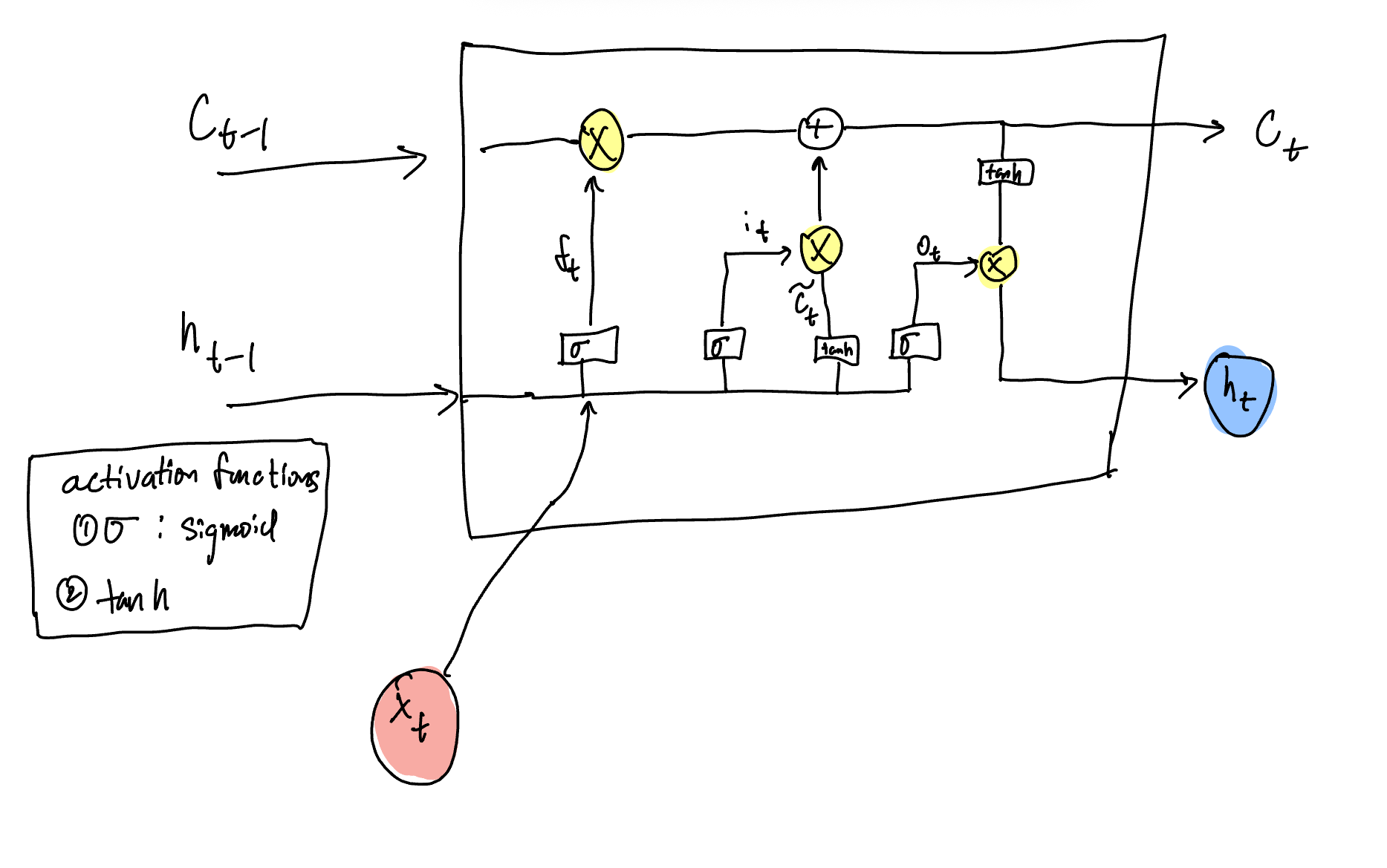 A great visual drawn from Sun et al. breaks down the exact MatVect operations at the junctions highlighted in X. From left to right inside of the LSTM block are forget gate, input gate, candidate cell state gate, and output gate.
