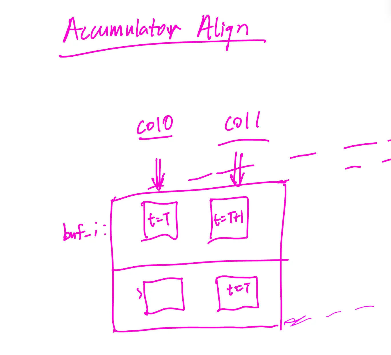 Once selecting the buffer to input data into, the beauty of a systolic array is that we also need to align the results such that results are streamed in as diagonals, just as the activation inputs and weight FIFOs are staggered. Thus, at time t=T, column 0 results arrive, and at time t=T+1 column 1 results arrive, allowing the buffer to be shipped out.