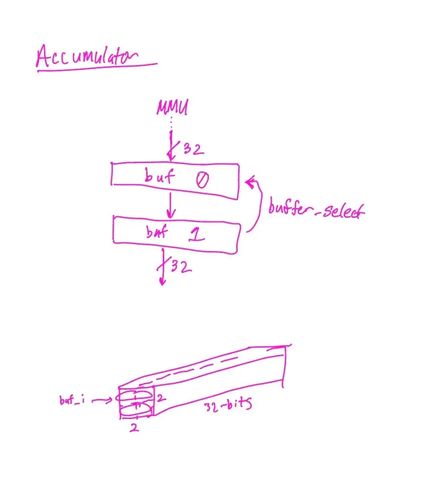 Double-buffering MMU results into the Accumulator works similar to the Weight FIFO scheme we’d mentioned prior. The Accumulator holds two 32-bit buffers that cycle out such that one is receiving inbound data from the MMU and one is passing along information at all times, selected in our code using “buffer_select”.