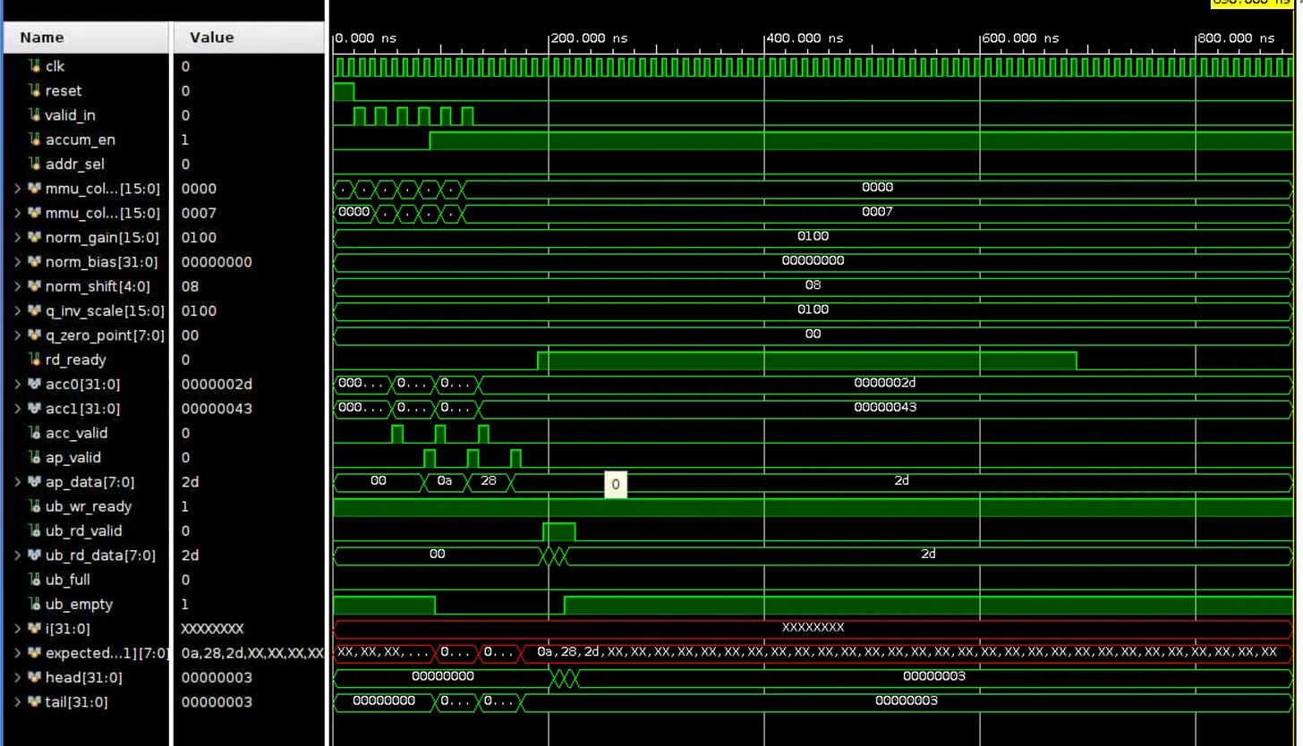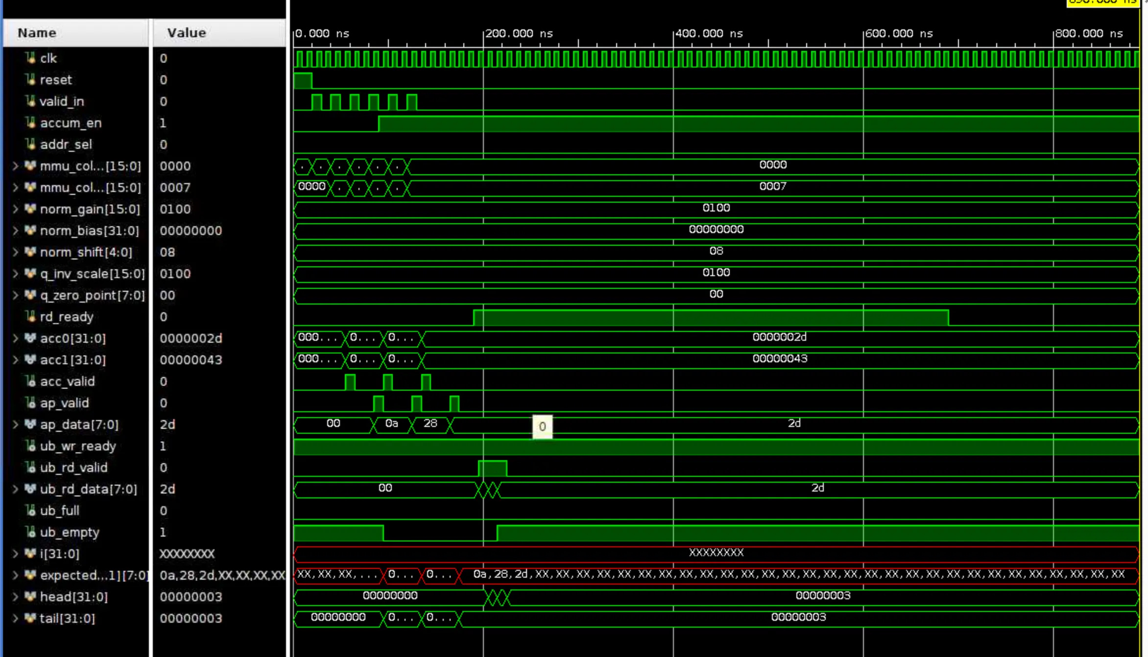 On the waveform, you can see the stimulus pulses valid_in during the early cycles; accum_en switches from overwrite to accumulate; configuration buses stay constant (unity scale, zero bias, zero-point). acc0 and acc1 show the aligned and accumulated 32-bit values; acc_valid and ap_valid pulse as data propagates through alignment, normalization, and quantization. ap_data shows the int8 outputs (e.g., 0x0a, 0x28, 0x2d), and ub_wr_ready remains high so the pipeline isn’t stalled. Later, rd_ready goes high to drain the buffer; ub_rd_valid/ub_rd_data reflect the readouts, and ub_empty deasserts/reasserts as data is consumed.