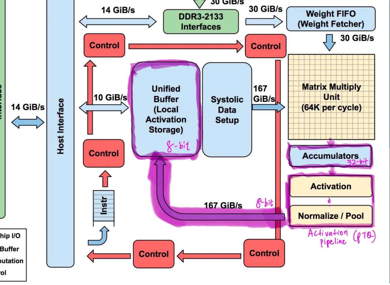 The provided diagram, with the dataflow highlighted in Purple (snazzy, right?) was referenced and helps clarify our specific terminology used in describing the TPU v1 dataflow feedback (Jouppi et al.).