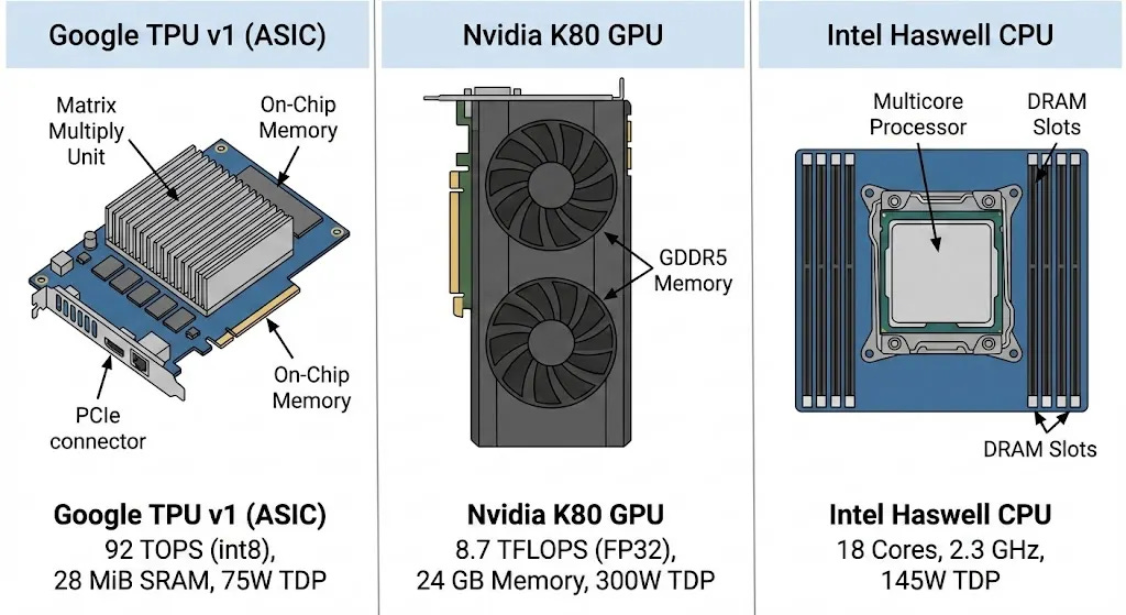 A hot take to call out GPUs, especially today! However, again, GPUs in the 2013-2014 era were still focused on training and running gaming / early crypto workloads. Although AlexNet was just around the corner, the K80 was not built for pure play inference due to strict latency limits, forcing the chip to run with smaller batch sizes. As a result, its massive compute cores were often underutilized as seen in the benchmarking rooflines between Haswell, K80, and TPU v1.