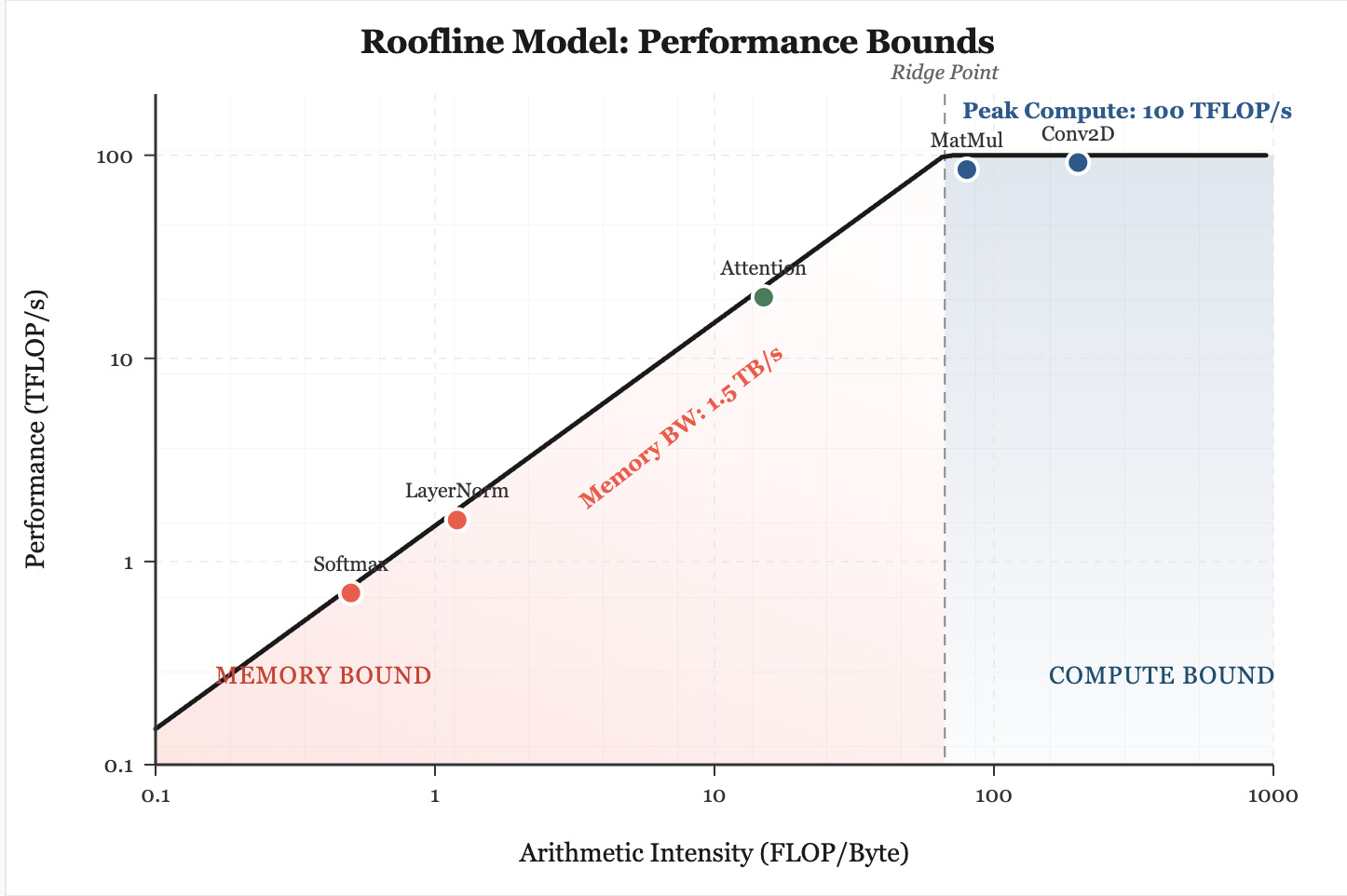 In modern ML workloads, a large proportion of the operations that slow down training are not the deep matrix multiplies or convolutions, in fact these often run close to the compute ceiling. Rather, it is the low-intensity operations such as layout conversions, transposes, layer normalization, softmax, and element-wise activations that dominate runtime because they shuttle substantial data through memory for relatively little computation. These operations occupy the far left of the roofline plot, trapped beneath the bandwidth ceiling, and no amount of additional FLOP capacity will accelerate them: hence why a lot of unoptimized ML workloads are memory-bound!